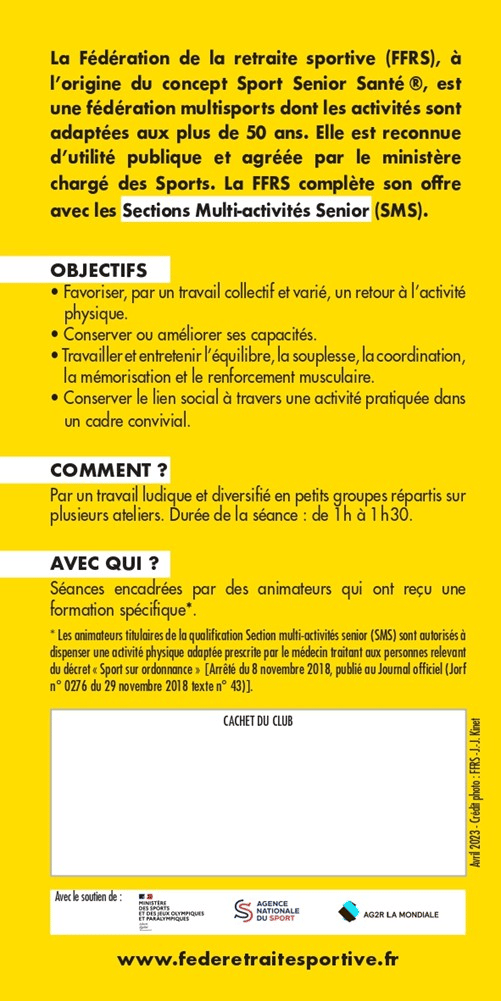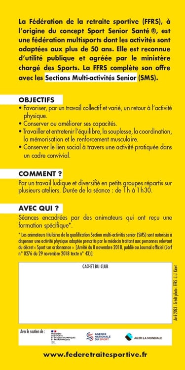 Développée par la FFRS, elle est composée de séances hebdomadaires (1H environ) d’activités physiques et sportives variées de type endurance, équilibre, coordination, coopération, opposition…dans le but de maintenir et de développer nos fonctions cognitives.